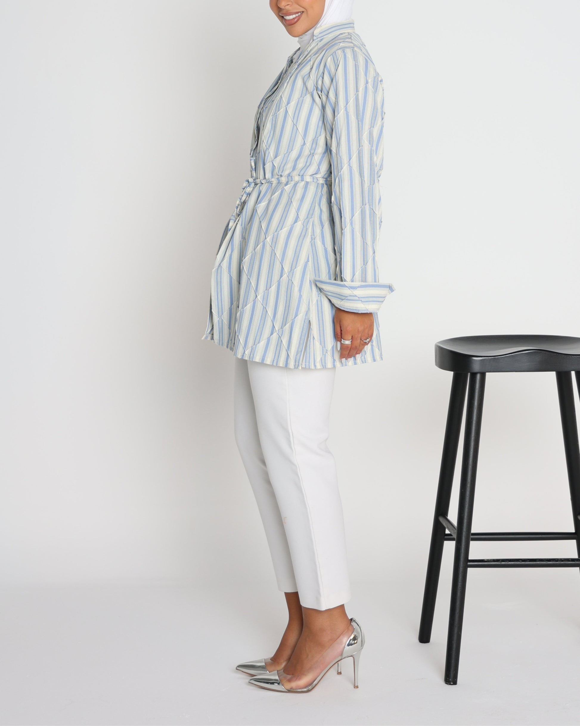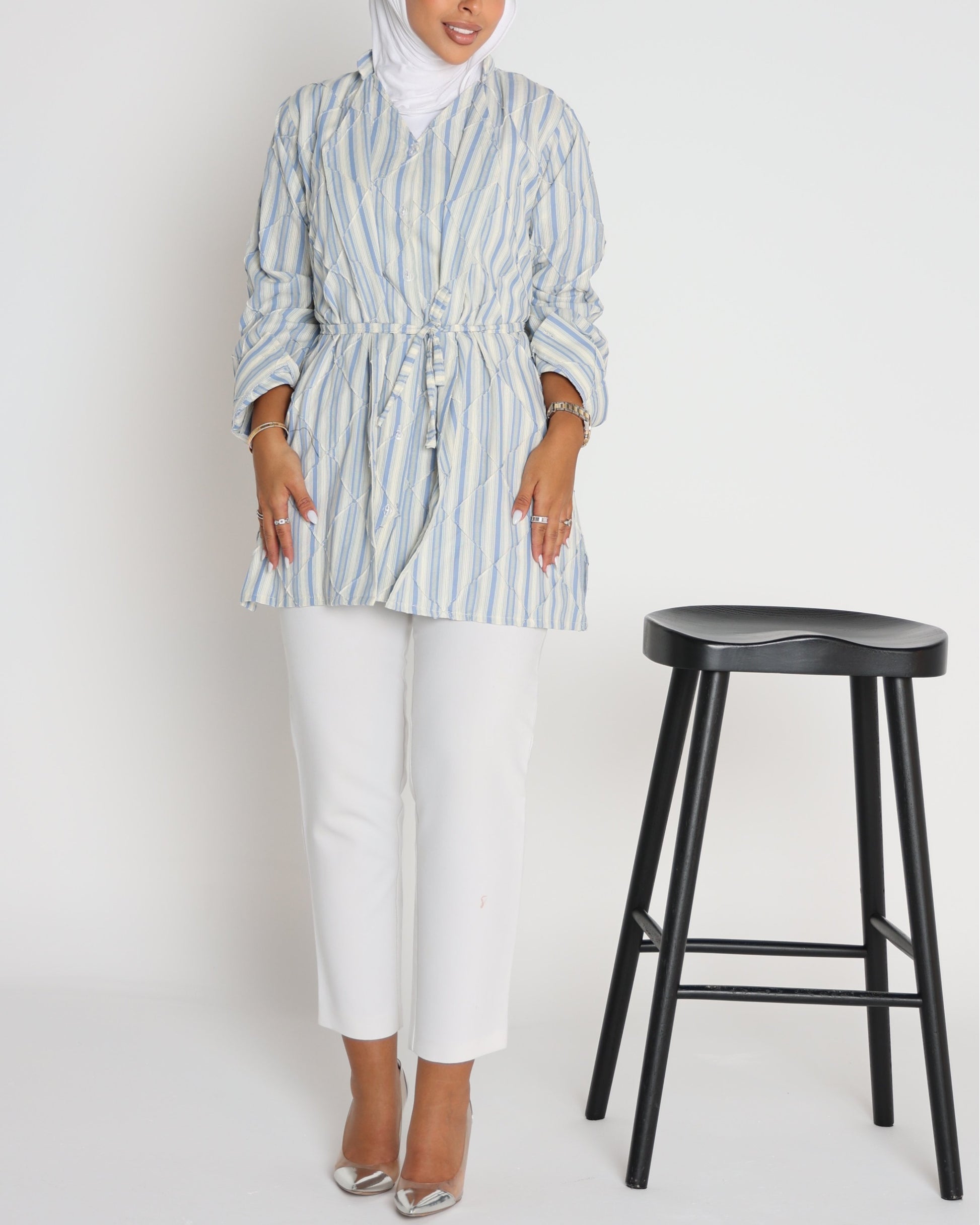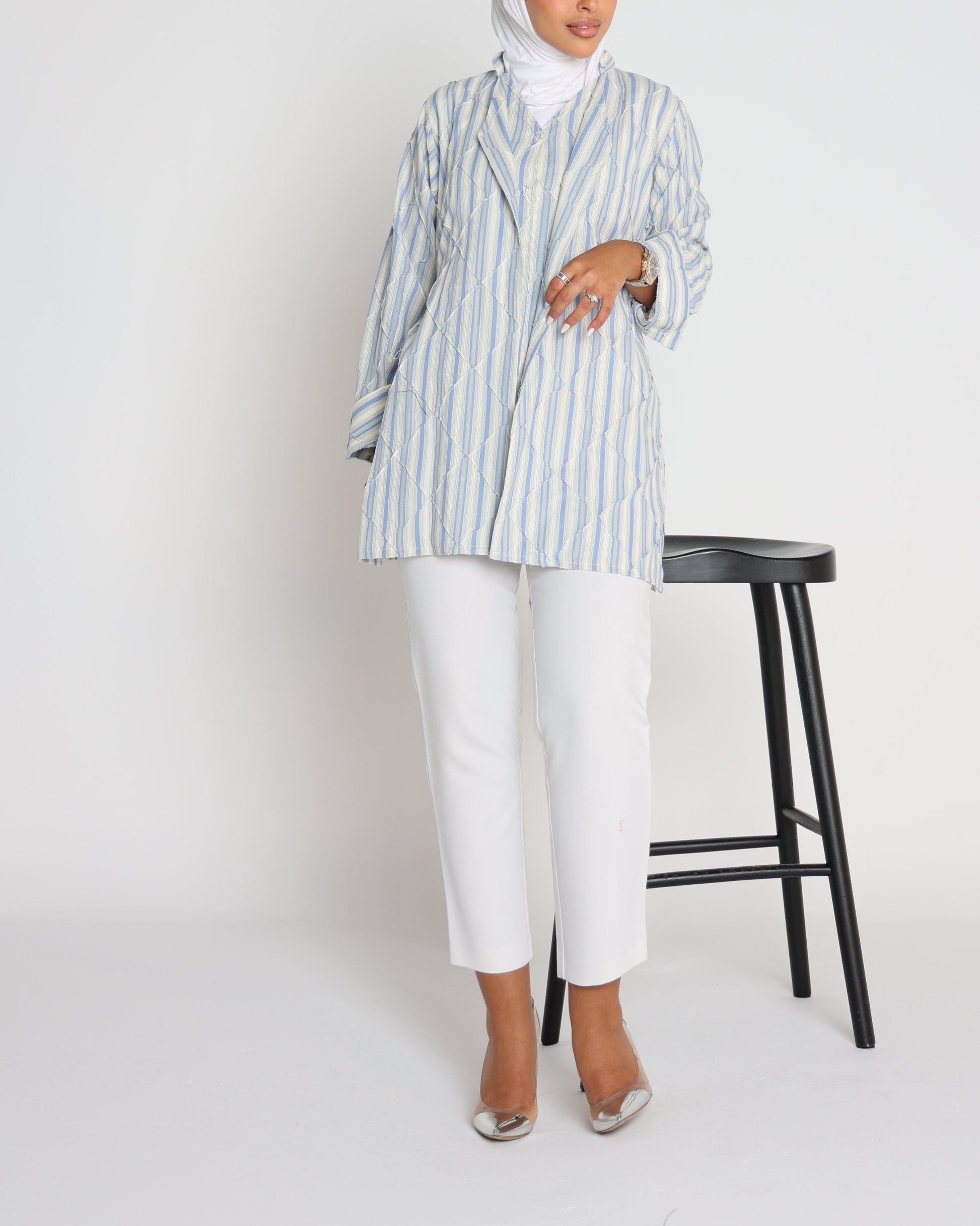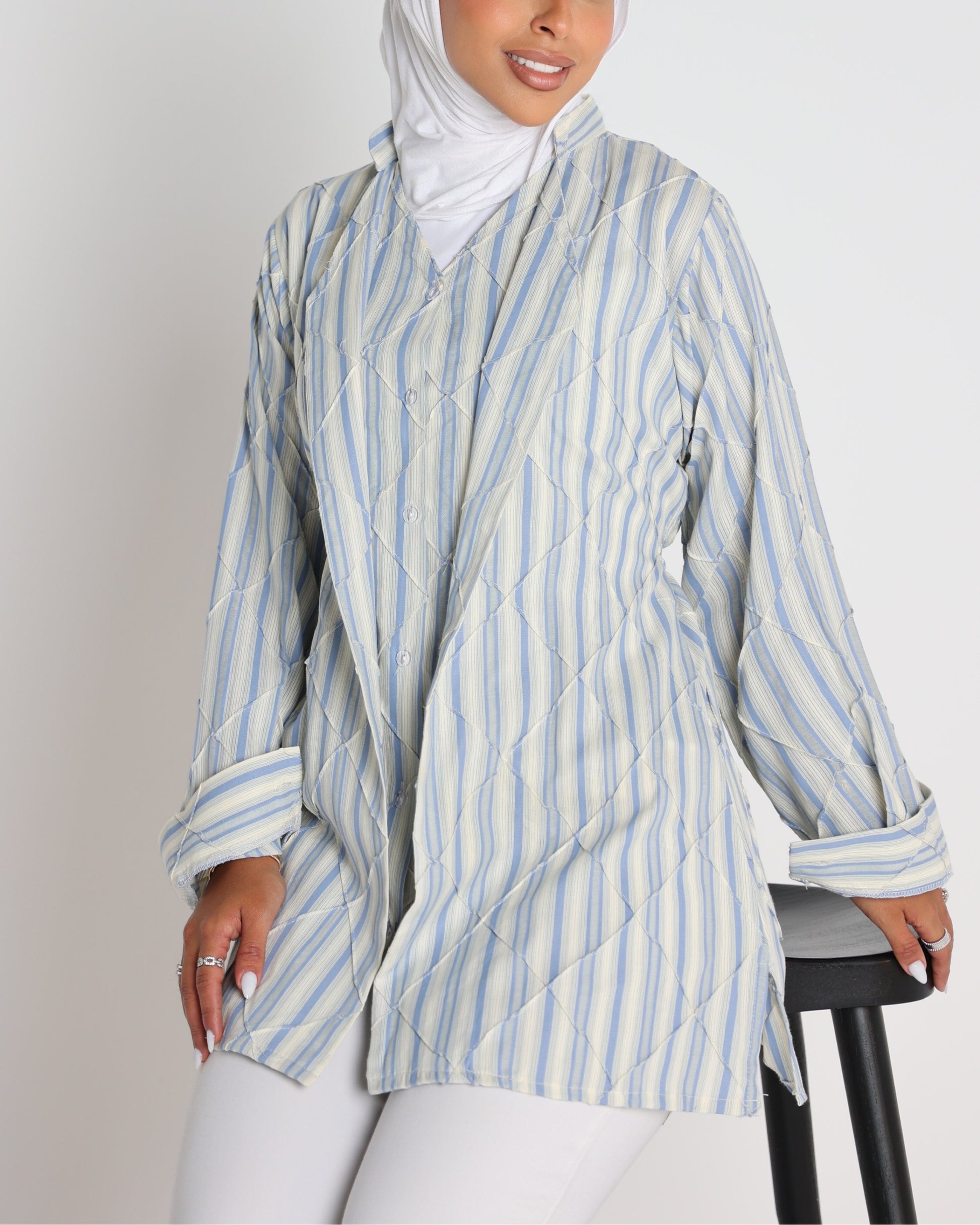 Meet Align — a shirt designed to bring structure and ease into your everyday. Crafted with soft striped fabric and detailed with subtle geometric stitching, it creates a clean yet elevated look. Perfect for layering at work or wearing solo on casual days, Align is where comfort meets authority.