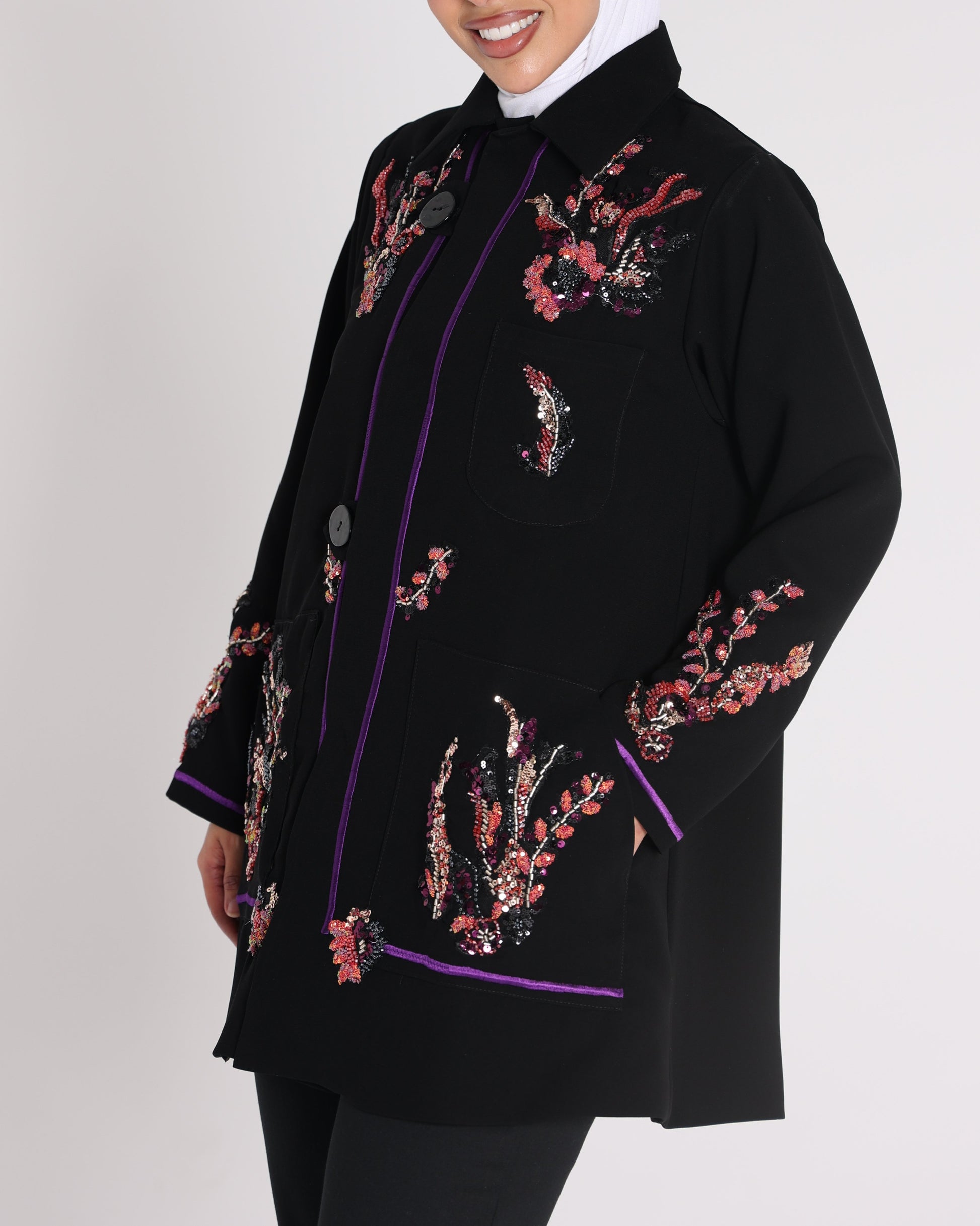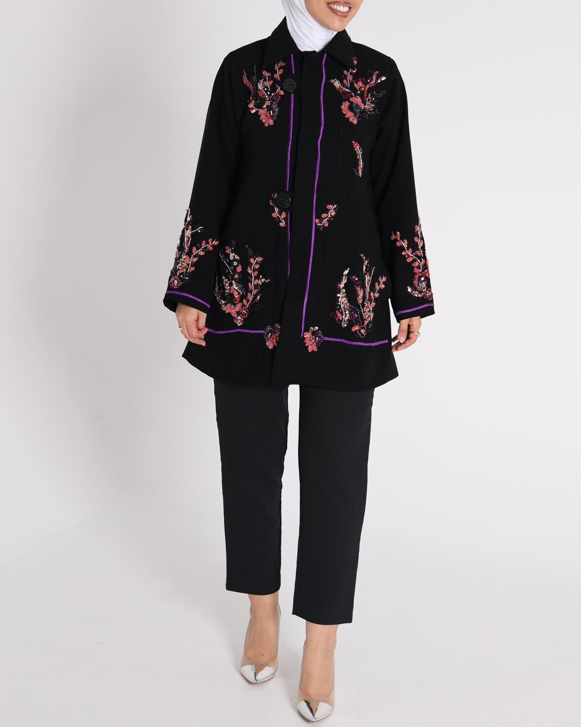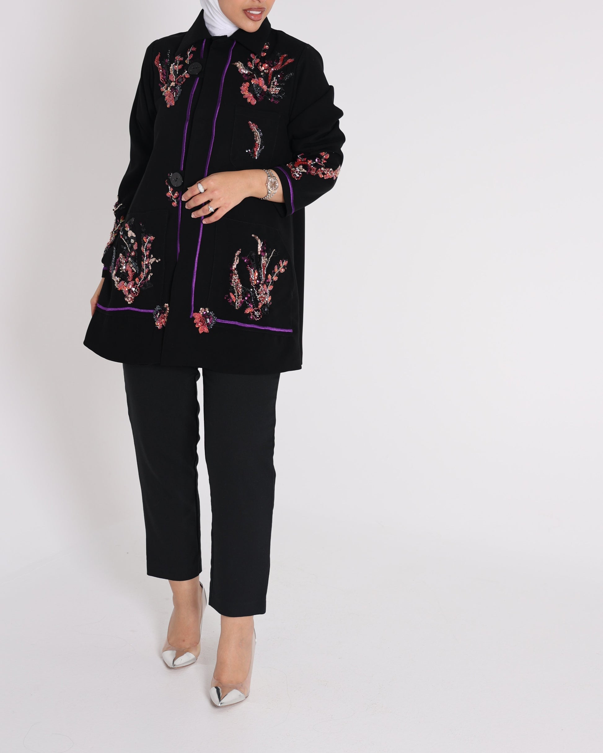This Black Maroon jacket features elegant black embroidery that adds a touch of sophistication to any outfit. Its stylish design and quality craftsmanship make it a wardrobe essential for a elegant, confident look.