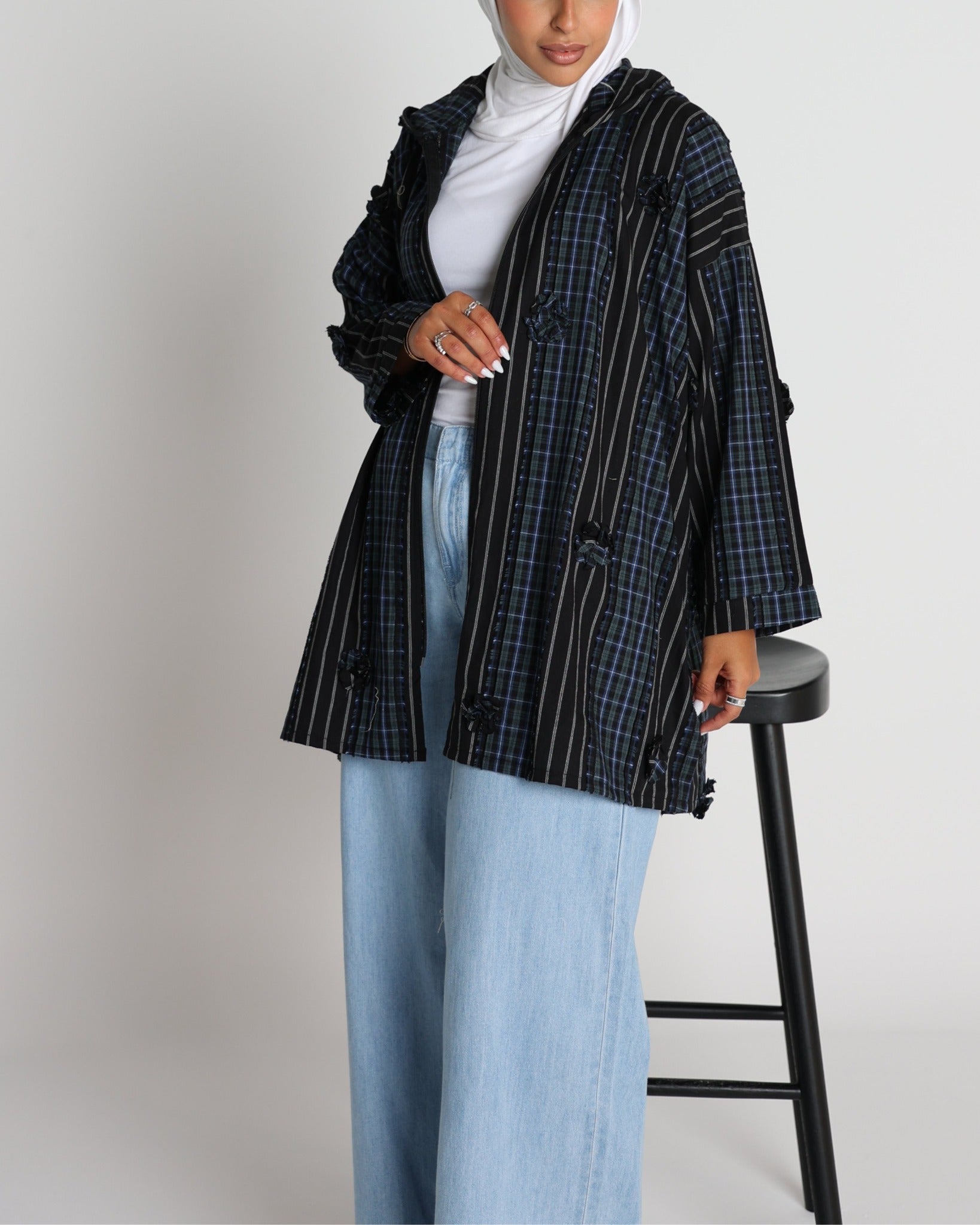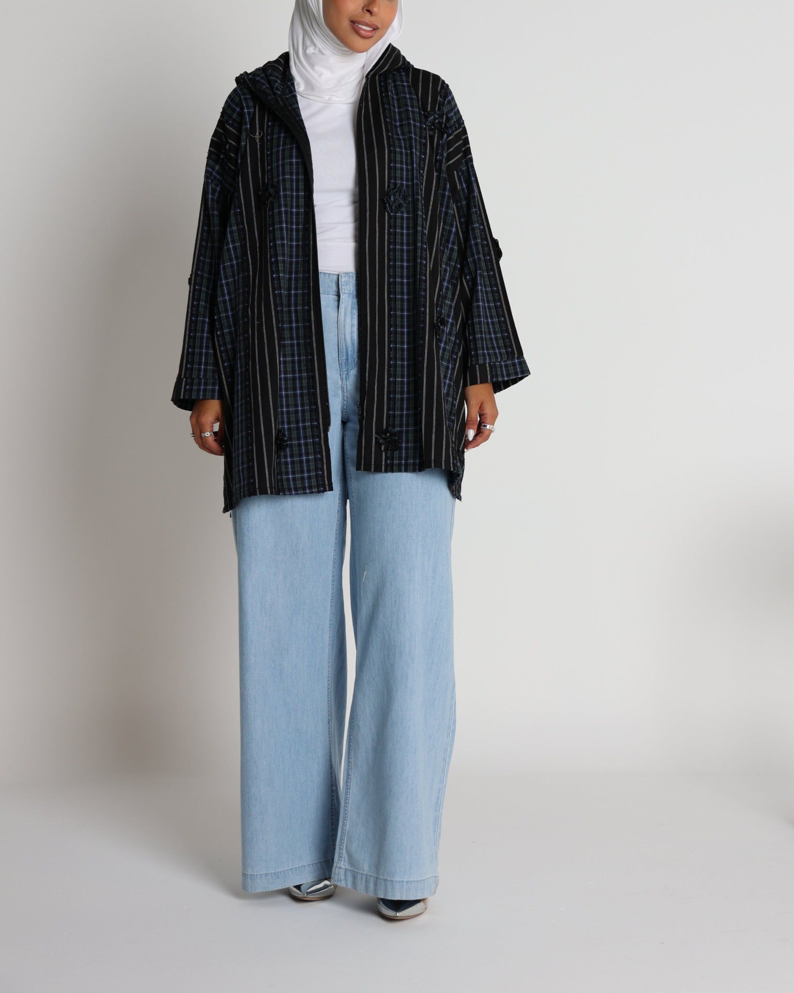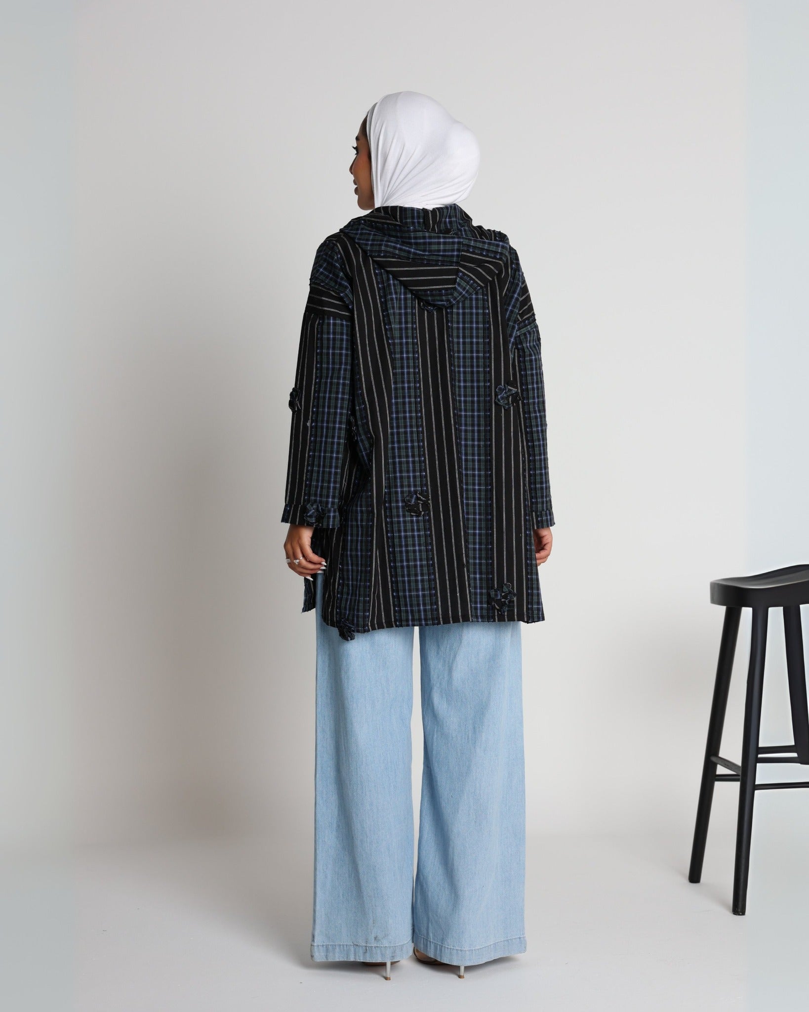 A stylish striped hooded jacket with a blend of black and blue plaid patterns, perfect for daily wear. Combines comfort and elegance for every day.