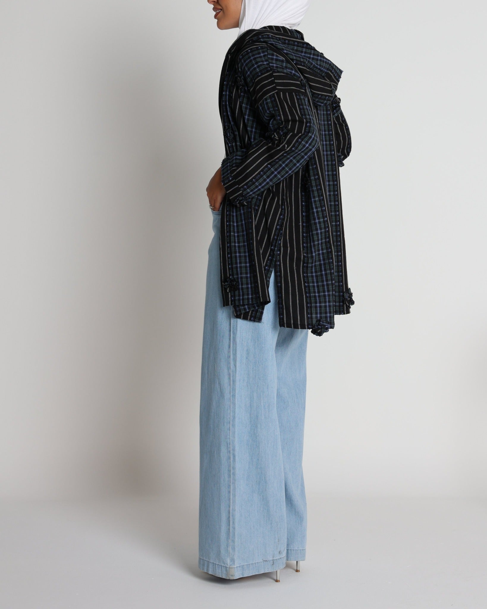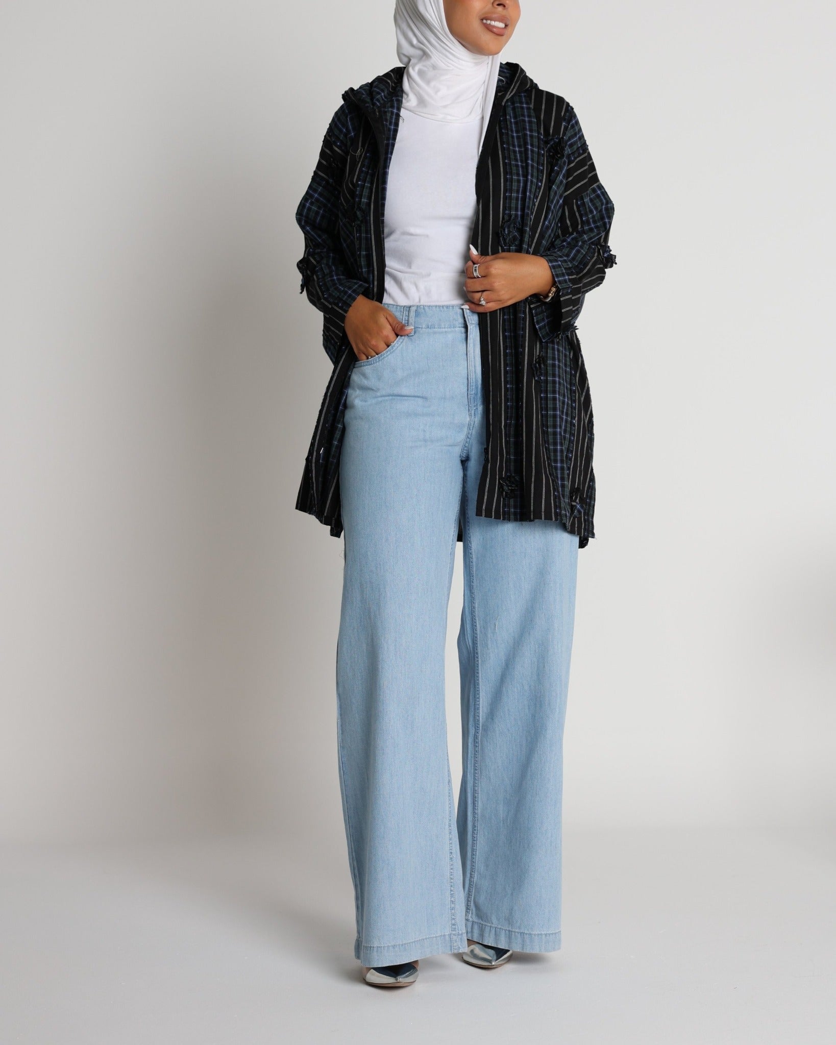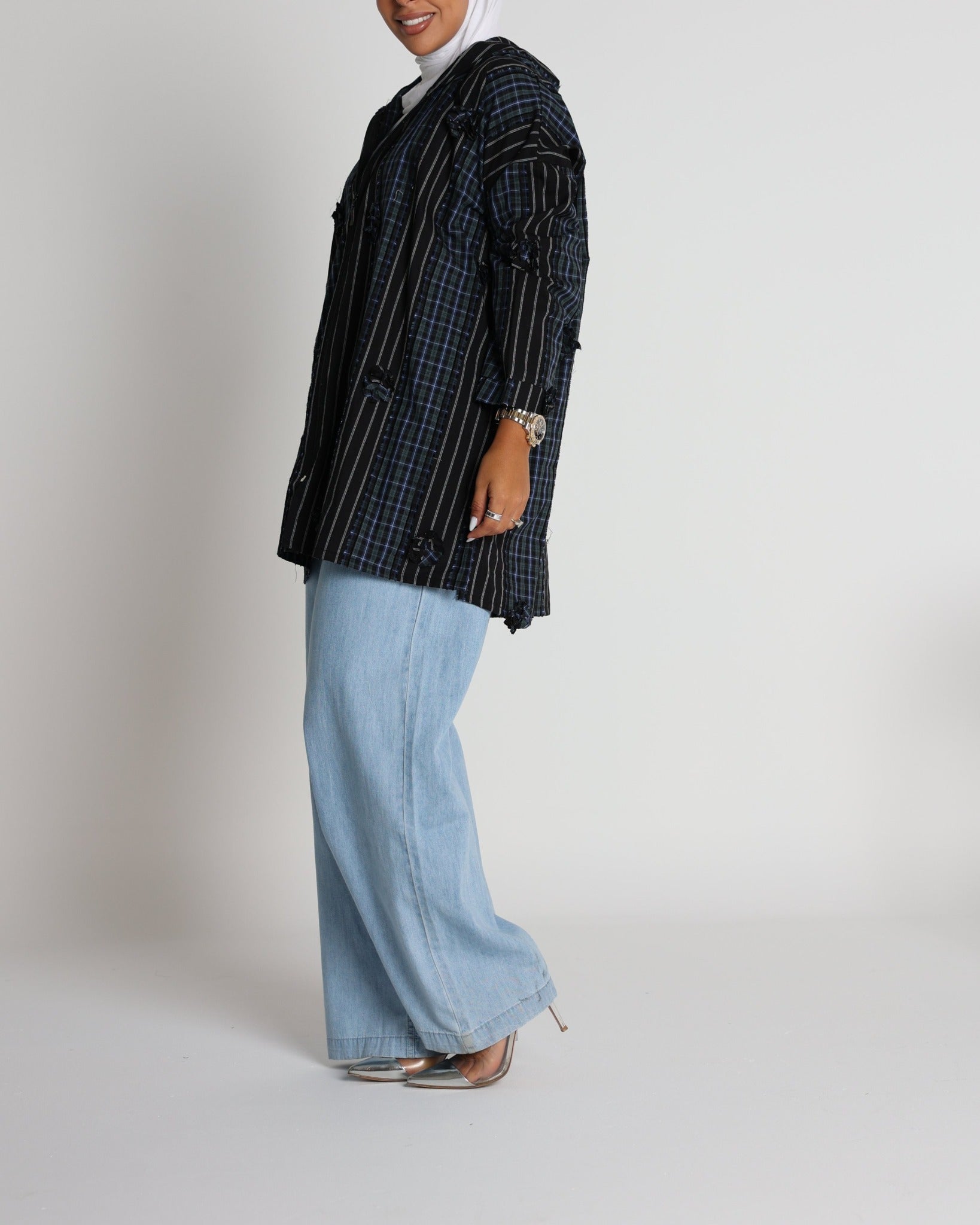 A stylish striped hooded jacket with a blend of black and blue plaid patterns, perfect for daily wear. Combines comfort and elegance for every day.