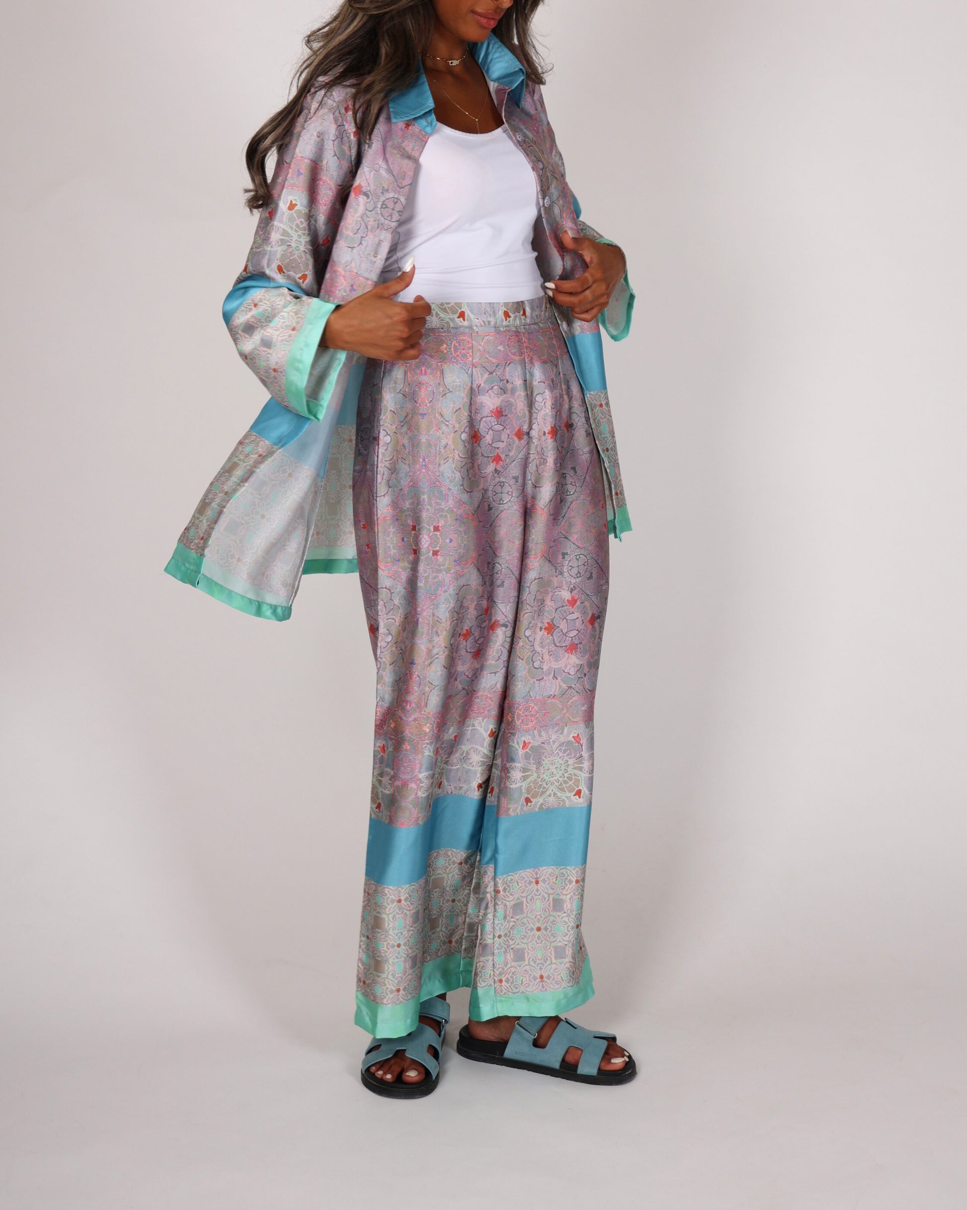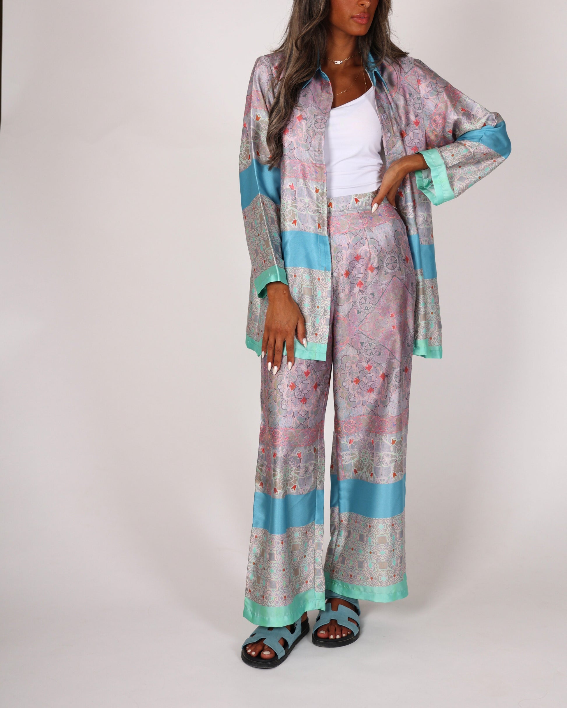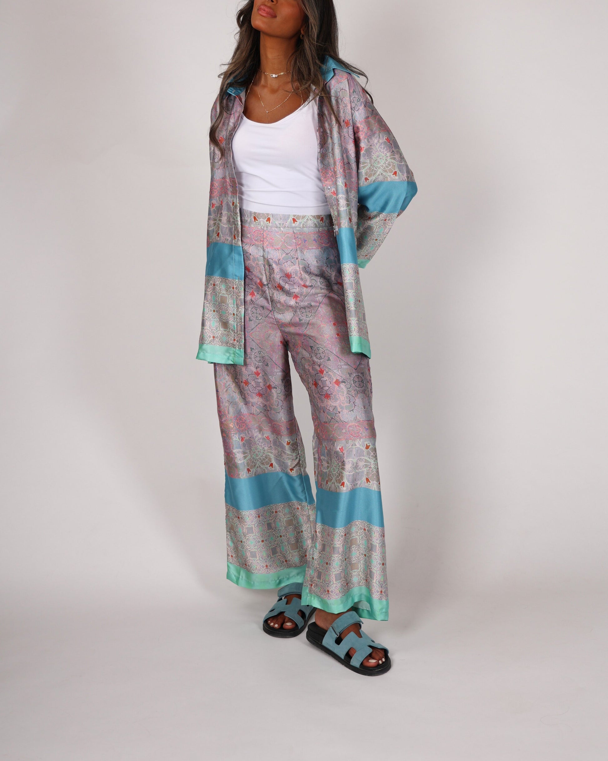 Experience the refined elegance of this silk set, featuring a luxurious shirt and matching pants crafted from smooth, breathable silk fabric. making it an ideal choice for both sophisticated casual and formal occasions. Its lightweight texture ensures all-day ease, while the timeless design complements a polished, expert wardrobe.