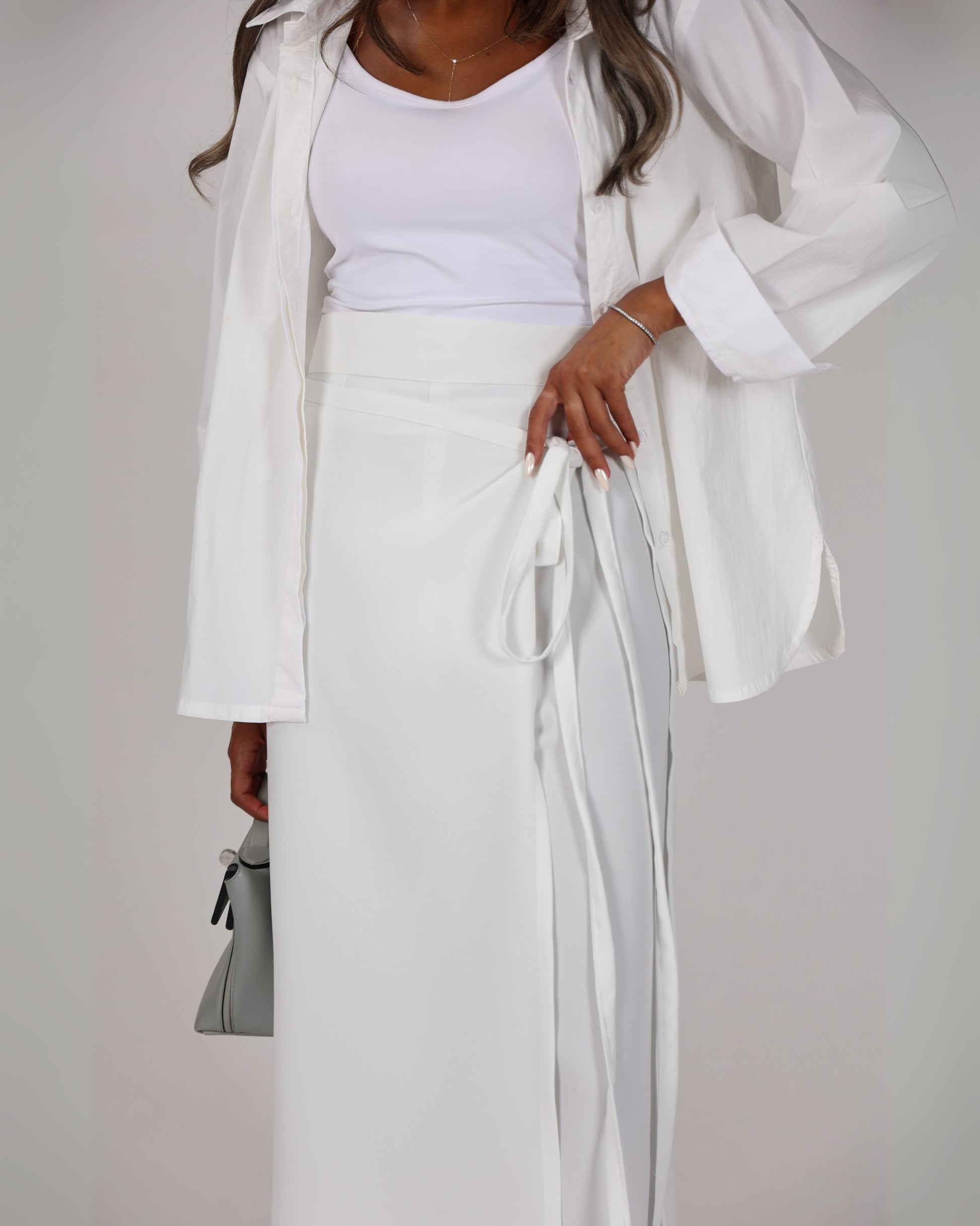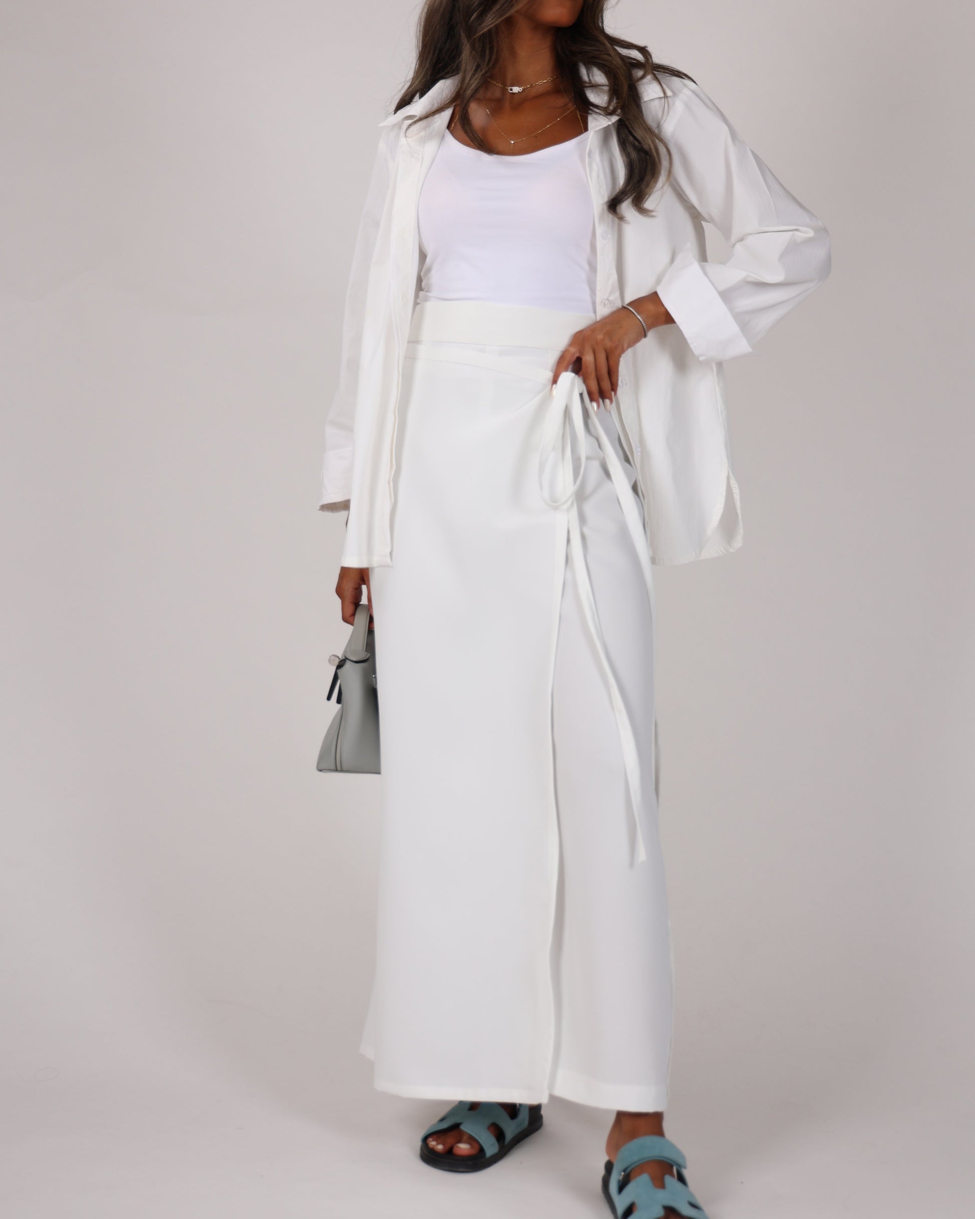 The Twinset combines tailored pants with a sophisticated coverup skirt.