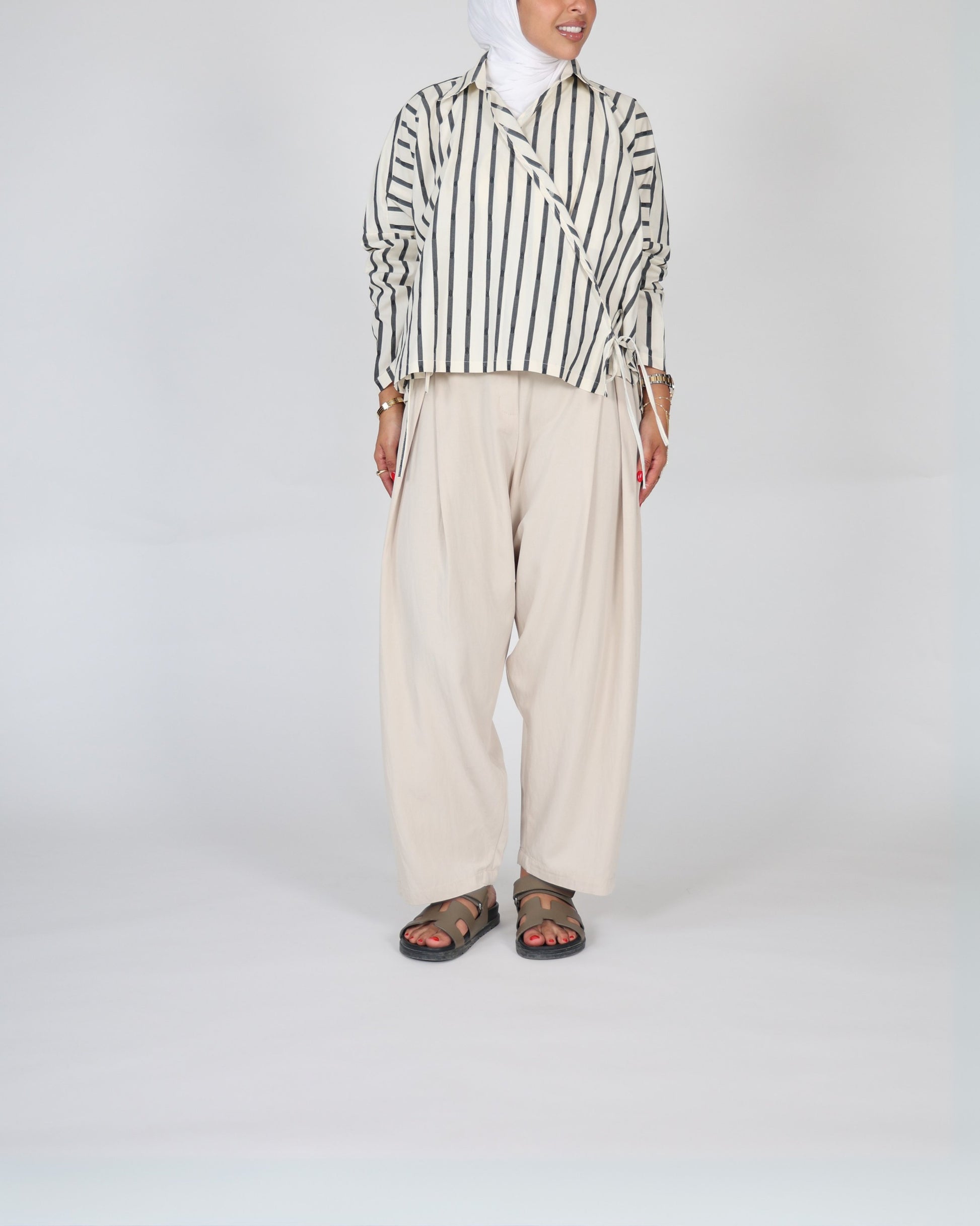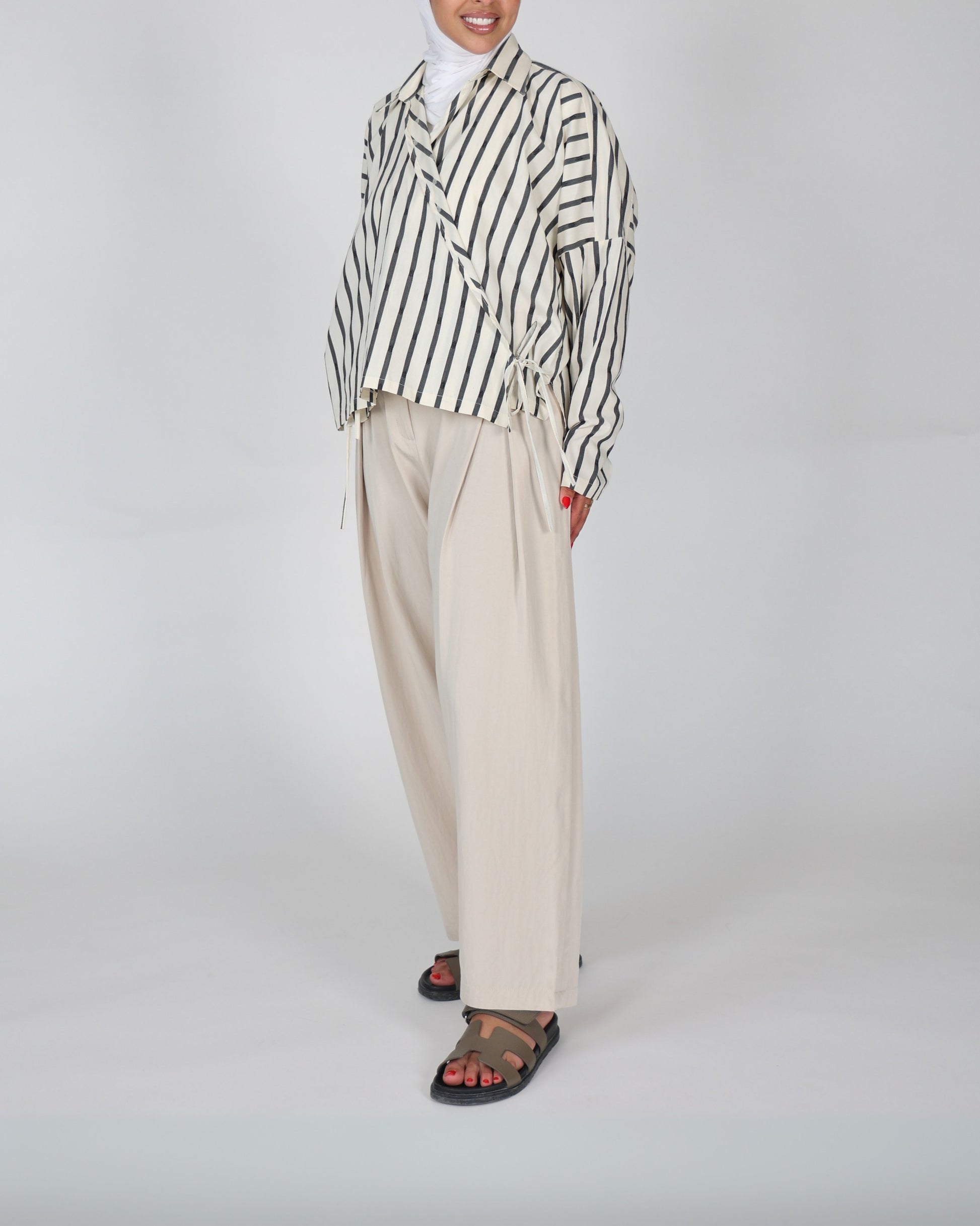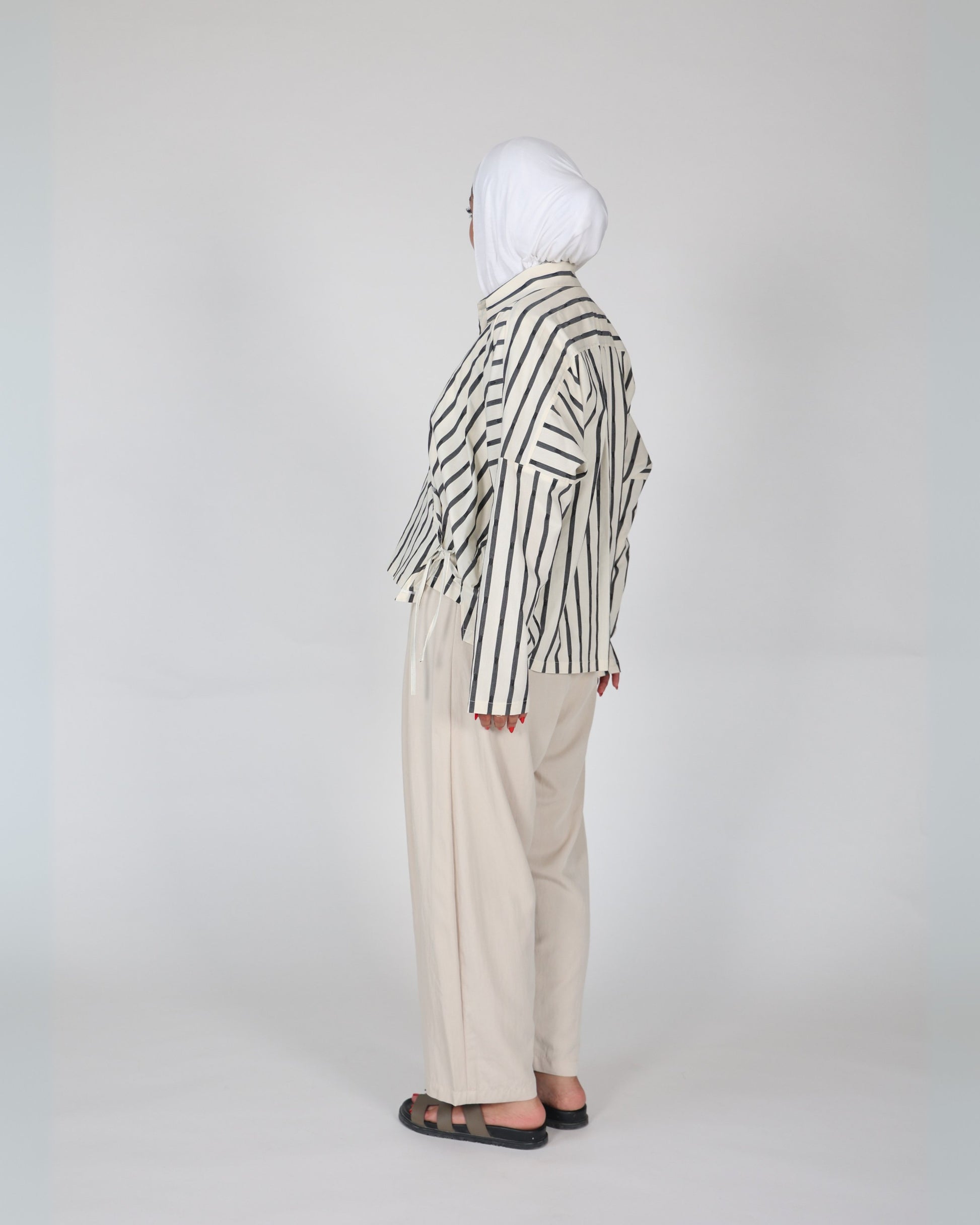 This ensemble pairs a classic striped shirt with modest pants, delivering a refined and comfortable look. The striped shirt offers timeless style, while the modest pants ensure ease of movement and a polished silhouette. Ideal for both casual and professional settings, this combination balances elegance with practical wearability.