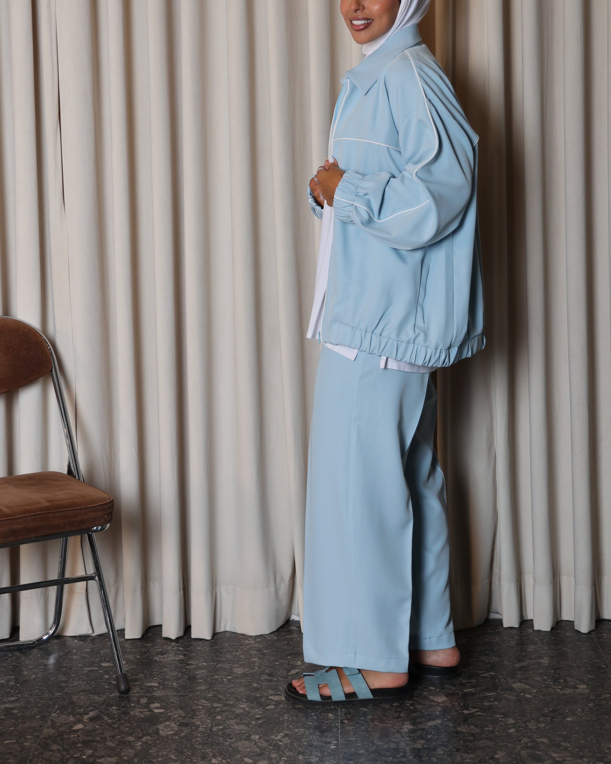 This stylish full set features a relaxed jacket and matching pants in a soft sky blue color. Made from comfortable fabric, it's perfect for everyday wear and can be dressed up or down. The jacket has a collar, gathered cuffs and hem, and pockets, while the pants have a relaxed fit.