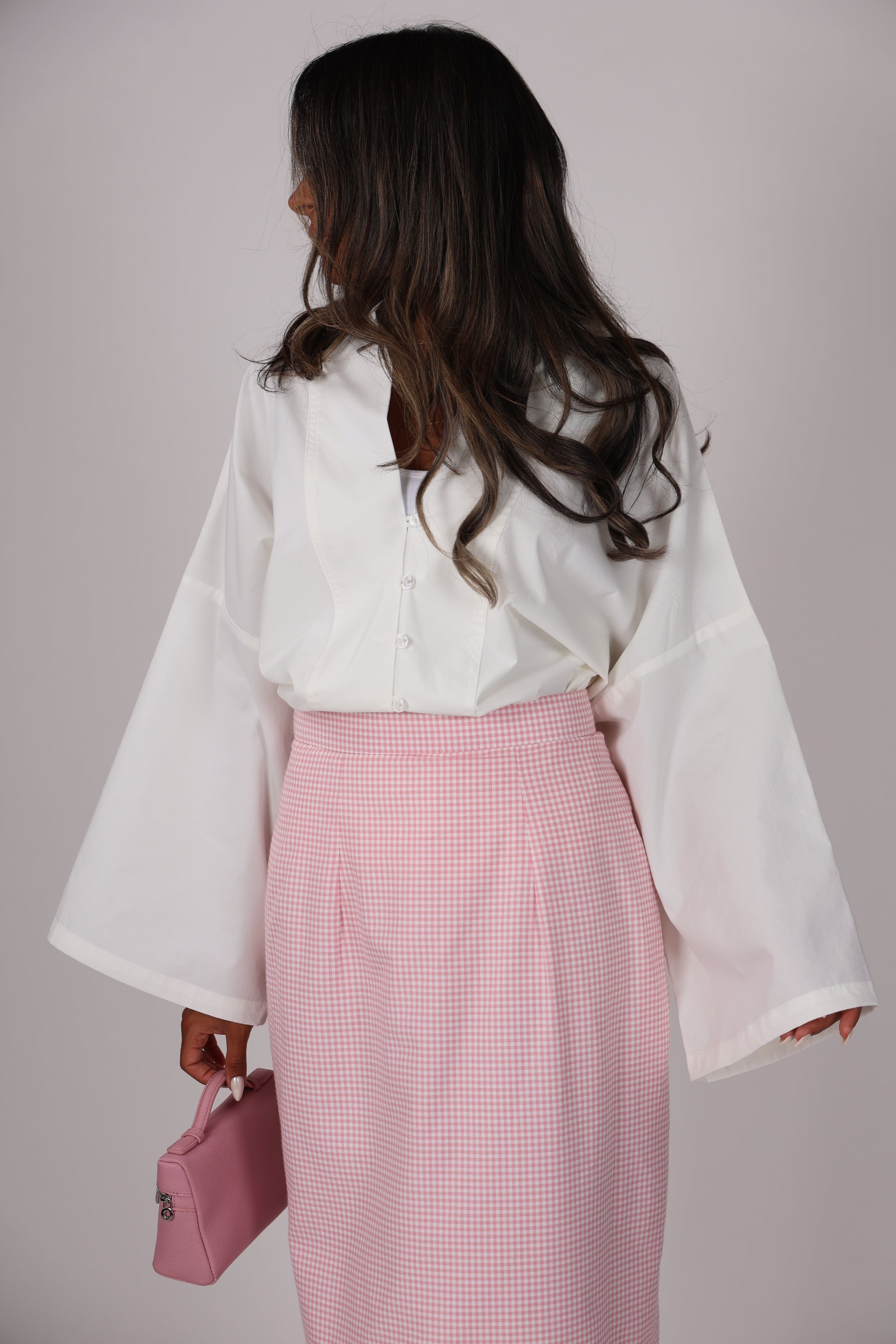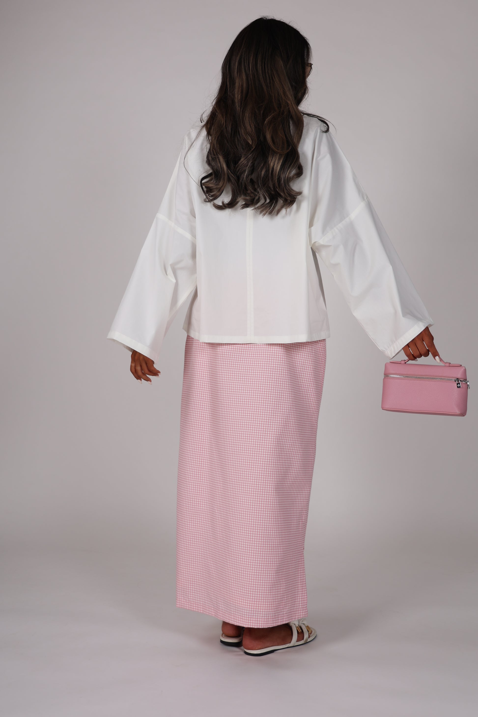 Timeless Ease combines a classic white shirt with a soft pink skirt to create a refined summery ensemble. Designed with breathable materials, the white shirt offers comfort and a crisp silhouette, while the pink skirt adds a subtle touch of color and femininity.